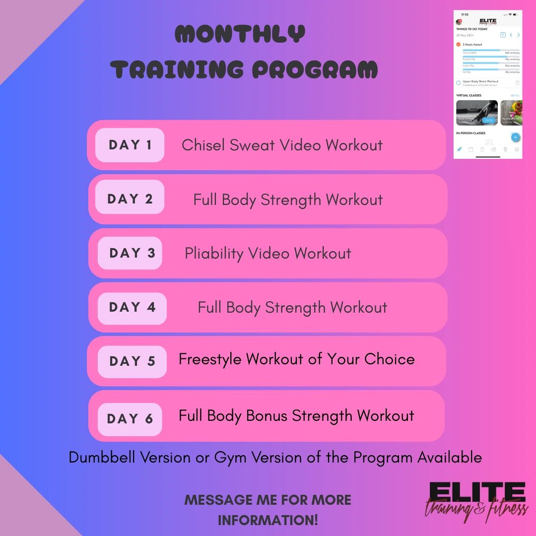 Join us every month as we follow a full fitness program including video workouts, a minimum of 3 strength training workouts, and a pliability workout video focused on improving mobility. Our routines change monthly so you will never get bored.